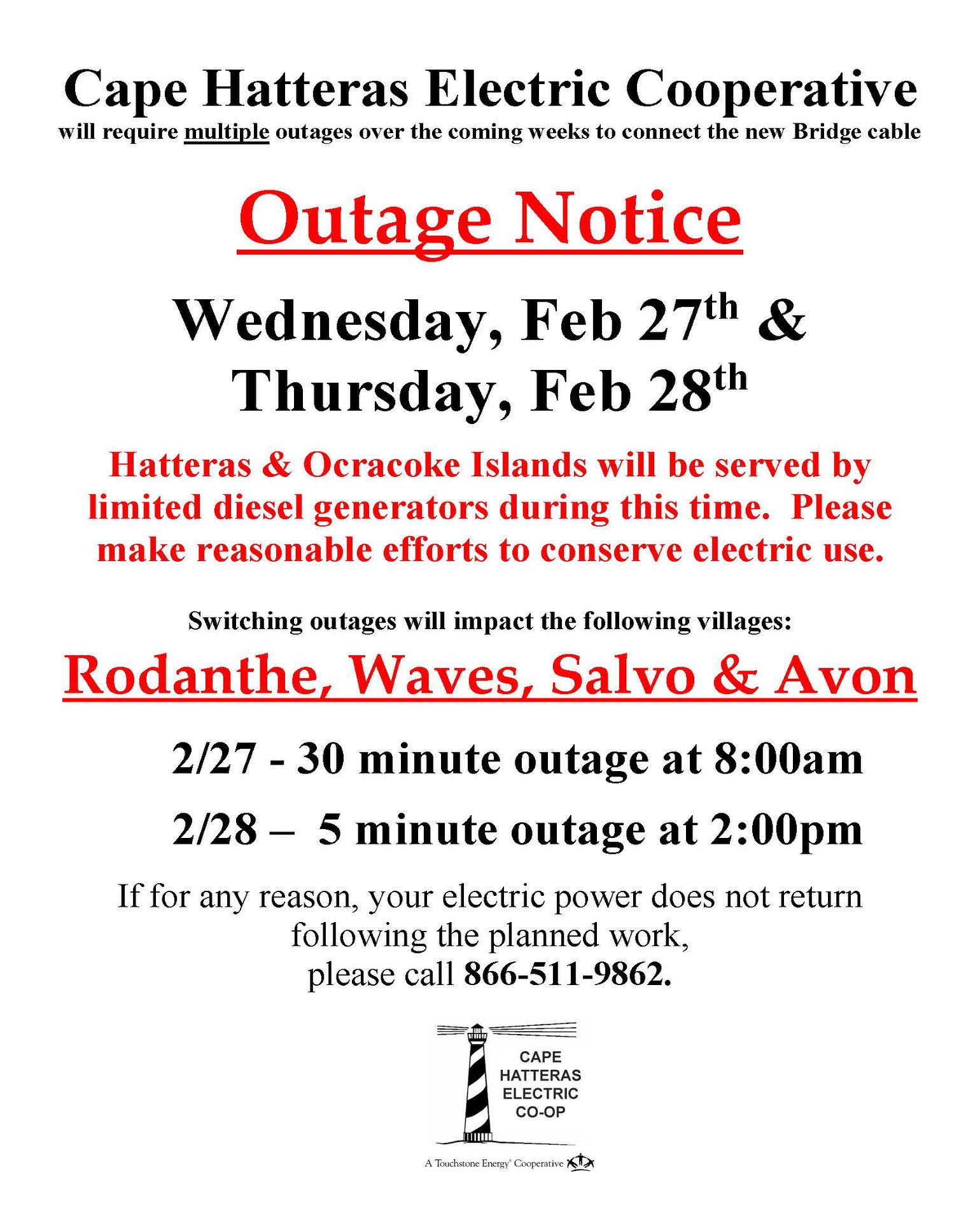 The time has come for Cape Hatteras Electric Cooperative to energize, test and put load on the new Oregon Inlet bridge transmission cables. Please note that Hatteras and Ocracoke Islands will be on generator service Wednesday, February 27 and Thursday, February 28. It may be necessary to conduct one or more planned outages over the next several weeks while Cape Hatteras Electric works to make the final switch to the new cables.