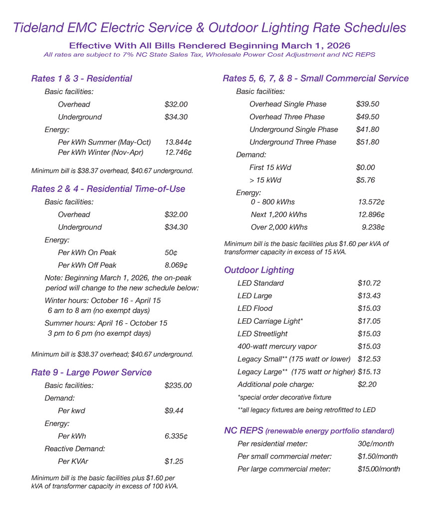 Since 2014, Tideland has had one base rate decrease and one increase. The time has come to implement a new base rate increase effective March 1, 2026. This issue of Tideland Topics focuses on the factors that necessitated a rate increase. Next month we will take a deep dive into the revamped residential time-of-use rate so you can decide if that rate may be beneficial to you and your family. That issue will also cover ways you can offset the base energy rate increase through efficiency and member portal tools.